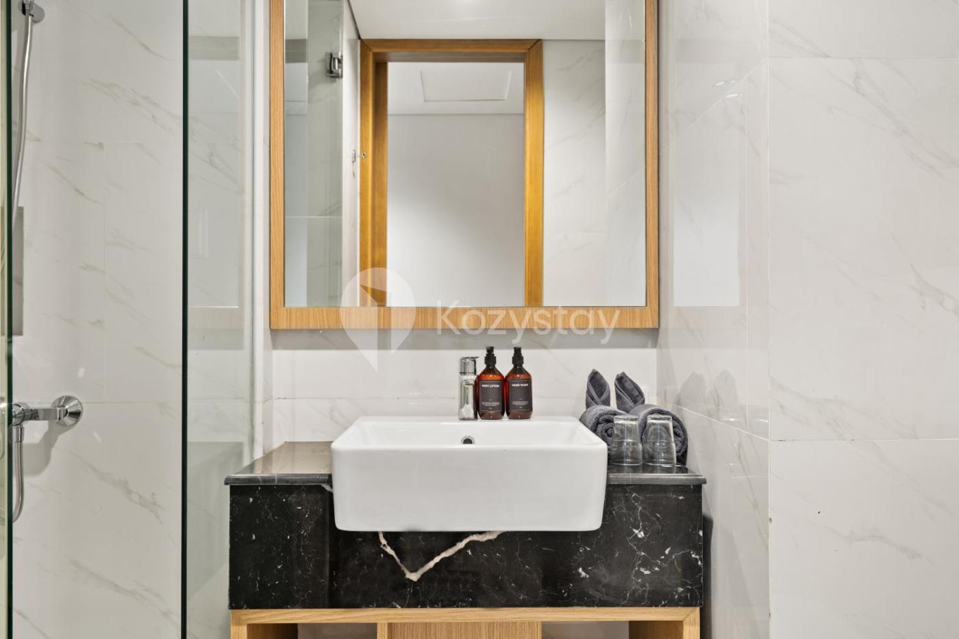 One-Bedroom Apartment. The air-conditioned apartment features 1 bedroom and 1 bathroom with a shower and a bidet. The well-fitted kitchen has a stovetop, a refrigerator, kitchenware and a microwave. This apartment is comprised of a dining area and a flat-screen TV with streaming services. The unit offers 1 bed.