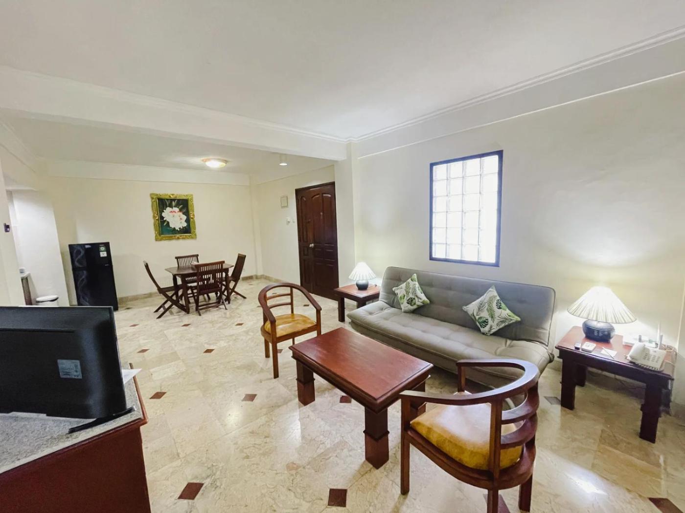 One-Bedroom Apartment. This air-conditioned apartment has 1 bedroom, 1 bathroom and a living room with seating and dining areas. The well-equipped kitchen features a refrigerator, a microwave, a toaster and an electric kettle. Boasting a balcony, this apartment also features a private entrance, a wardrobe and a flat-screen TV with satellite channels. The unit has 2 beds. ;